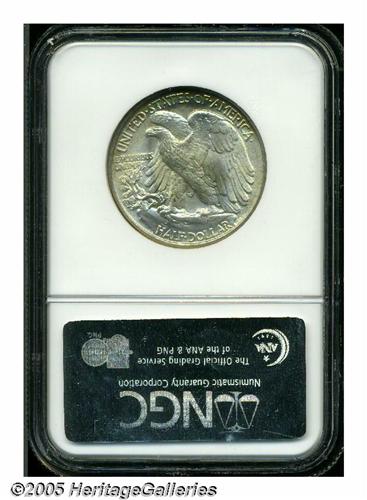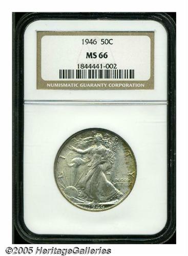 <B>1946<50C> MS66 NGC,</B></I> peach and lime colors frame the borders, light chestnut and gray patina fills the centers, well struck; and a <B>1946 MS66 NGC,</B></I> aqua, orange, stone-gray, and ruby patina, a decent strike.