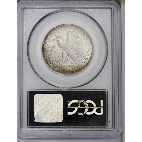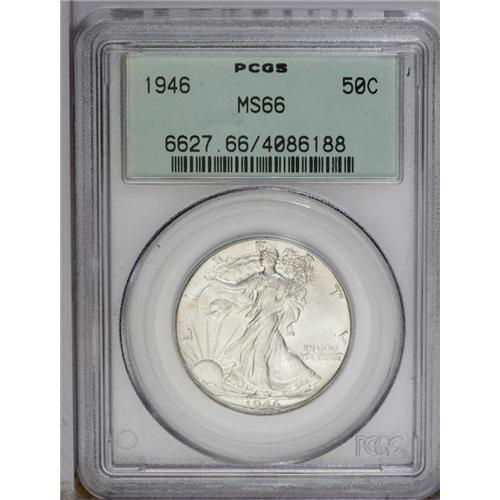 <B>1946<50C> MS66 PCGS.</B></I> Boldly defined throughout with subtle luster on both sides, an essentially white obverse, and variegated toning around the legends of the reverse. <BR><BR><B>Important notice:</B> Heritage usually auctions material at the rate of 200-250 lots per hour. On some occasions eBay Live bid software or the Internet may not be able to keep up with the pace of the auction. We recommend placing a realistic absentee bid now as insurance to avoid disappointment. Occasionally the auctioneer may eliminate or reject an eBay Live bid, and the auctioneer may also reopen a lot after the close of the eBay live bidding (usually because we missed an audience bid), and may reject your bid even if it shows you as the winning bidder. By bidding via eBay Live, you agree that Heritage may award the lot to another bidder at its sole discretion under the circumstances described above or any other reasonable circumstances. Since eBay bids are not shown to us until we open the lot on the floor, we treat those bids just like floor bids. In most cases the floor responds before the eBay bid is presented to us, due to Internet lag time, so for consistency we have made it a policy that floor bids are always considered first over tie eBay live bids. Also please note that all Heritage lots purchased through eBay Live carry a 20% Buyer's Premium. Please make sure you read the Terms and Conditions before you bid. This lot is being auctioned in conjunction with a live floor auction by Heritage Galleries & Auctioneers. All final auction and invoice information will be supplied by Heritage Galleries & Auctioneers, and all other information should be considered preliminary. Lot:3024 <BR><BR><B>Winning Notification and Billing:</B> After the FINAL session in this auction is complete, Heritage will send e-mail and snail mail invoices. This process normally takes several days. All final auction and invoice information will be supplied by Heritage Galleries & Auctioneers, and all other information should be considered preliminary. <BR><BR>This auction will be conducted on a live auction floor and over the Internet through eBay Live. If you choose to place an absentee bid, please take a moment to <font color='#0000ff'><u><a href='http://pages.ebay.com/liveauctions/help/before/laabsentee.html'>learn how eBay Live absentee bidding works</a></u></font><font color='#000000'>