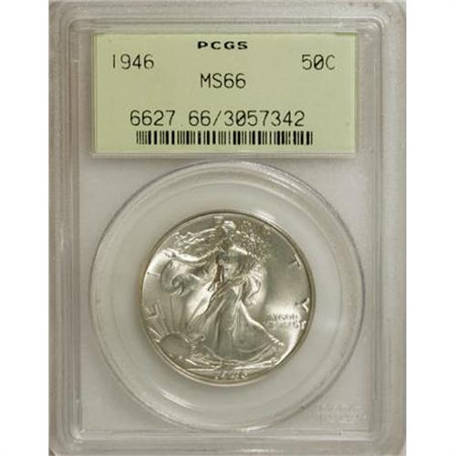 <B>1946 50C MS66 PCGS.</B></I> PCGS Population (698/20). NGC Census: (494/27). Mintage: 12,118,000. Numismedia Wsl. Price for NGC/PCGS coin in MS66: $320. (#6627)<BR><BR><B>Coin Engraver:</B> Adolph A. Weinman<BR><BR><b>Shipping:</b> Coins & Currency (<a target="_blank" href="http://www.heritageauctions.com/common/shipping.php">view shipping information</a>\)