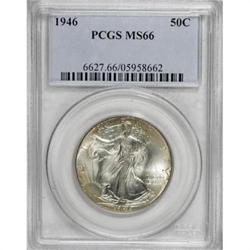 <B>1946 50C MS66 PCGS.</B></I> PCGS Population (703/20). NGC Census: (495/27). Mintage: 12,118,000. Numismedia Wsl. Price for NGC/PCGS coin in MS66: $320. (#6627)<BR><BR><B>Coin Engraver:</B> Adolph A. Weinman<BR><BR><b>Shipping:</b> Coins & Currency (<a target="_blank" href="http://www.heritageauctions.com/common/shipping.php">view shipping information</a>)
