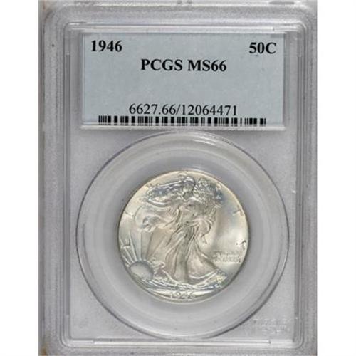 <B>1946 50C MS66 PCGS.</B></I> PCGS Population (717/20). NGC Census: (495/27). Mintage: 12,118,000. Numismedia Wsl. Price for NGC/PCGS coin in MS66: $320. (#6627)<BR><BR><B>Coin Engraver:</B> Adolph A. Weinman<BR><BR><b>Shipping:</b> Coins & Currency (<a target="_blank" href="http://www.heritageauctions.com/common/shipping.php">view shipping information</a>)