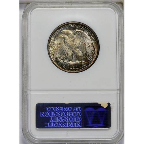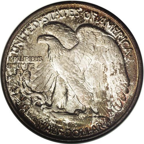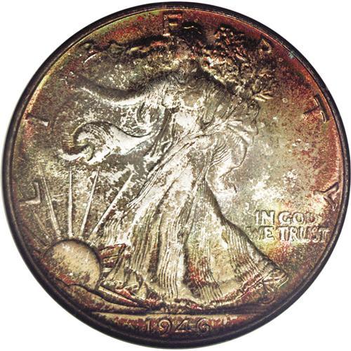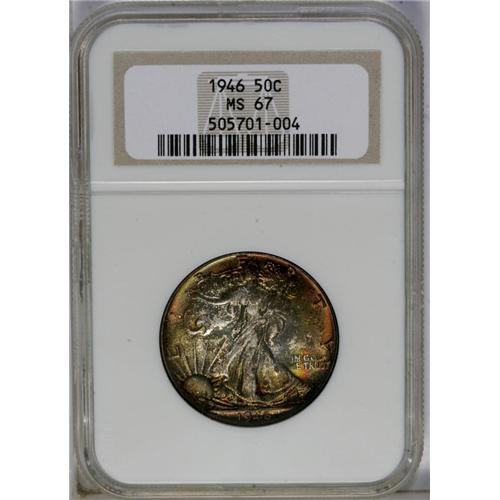 <B>1946<50C> MS67 NGC.</B></I> Lustrous surfaces reveal a magnificent blend of olive and forest-green, magenta, and mauve-gray patination. The design elements are well impressed, including nearly full definition on Liberty's thumb. A couple of unobtrusive marks in the right obverse field are mentioned for accuracy. Housed in a prior generation holder. Census: 25 in 67, 1 finer (6/06).