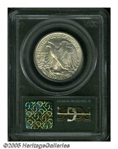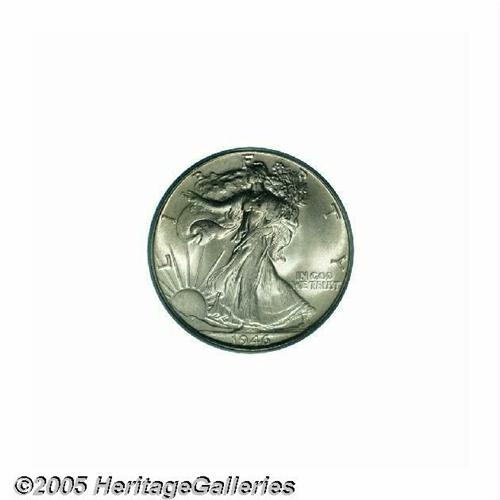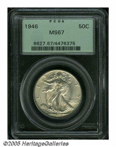 <B>1946<50C> MS67 PCGS.</B></I> Although many observers would call this lustrous Superb Gem fully brilliant, both sides possess light tan-gray color. Beautifully undisturbed, the piece appears immaculate at first glance, and thorough evaluation does not locate mentionable contact. The 1946 is a better date at the Superb level, with a certified population much lower than the Philadelphia wartime Walkers. Encapsulated in a green label holder. Population: 19 in 67, 0 finer (6/05).