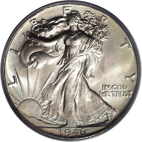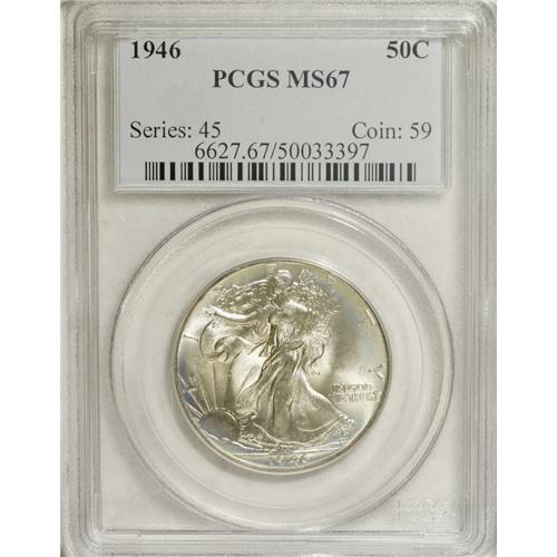 <B>1946 50C MS67 PCGS.</B></I> Delicate honey-gold and sky-blue tints endow this formidably lustrous Superb Gem. The strike is sharp, and both sides are impeccably preserved. A wonderful representative from the penultimate date of the popular silver type. Population: 20 in 67, 0 finer (2/07).<BR><BR><b>Shipping:</b> Coins & Currency (<a target="_blank" href="http://www.heritageauctions.com/common/shipping.php">view shipping information</a>)