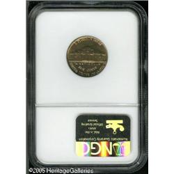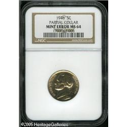 <B>1946 5C Jefferson Nickel--Partial Collar--MS64 NGC.</B></I> A satiny and nicely struck piece that has dashes of mauve and electric-blue color. Lot:10958