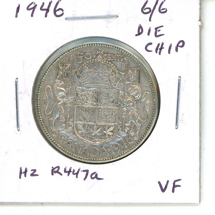 1946 6/6 Canadian Silver 50 Cents. There is a large Die Chip in the 6. Hans Zoell R447a. VF-20. Scarce.