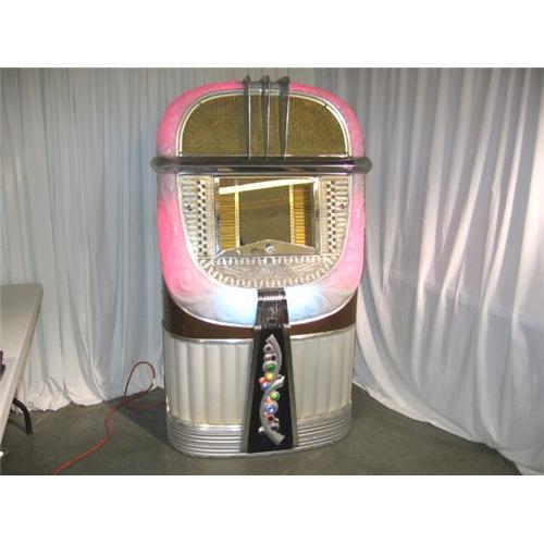 Now available is this rare 1946 AMI Model A Jukebox, that is all original and still works, playing 40 selections (from 20 records) of 78's! It came from New York and has been very well taken care of. The jukebox has veneer, which we believe is walnut, on the sides and top, and the signature plastic on the front - in pink and opalescent. The bottom has the opalescent fluted panels that are accented with colored glass gemstones. There are signs of wear, especially on the veneer and chrome. The back has the AMI label with all of the information about this model. The jukebox measures 66 5/8" in height, 39" from side to side, and 30" from front to back. Weight is approximately 220 pounds.