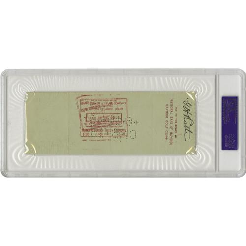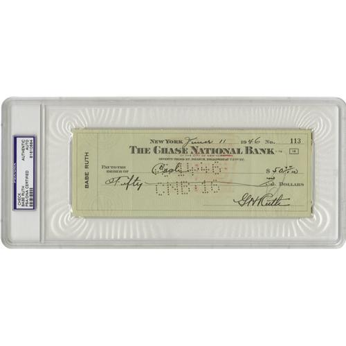 <B>1946 Babe Ruth Double Signed Check.</B></I> While any Ruth check is worthy of tremendous collecting interest, the rare dual-signed example definitely does far more than double the appeal. Here we present a top specimen from that scarce supply, a "June 11 1946" personal check on Ruth's "The Chase National Bank" account made out to fifty dollars cash. He signs off at lower right, and then endorses the check with the same "G.H. Ruth" autograph on verso. PSA/DNA has authenticated and graded each of the two signatures, awarding the first a score of Mint 9 and the second NM-MT 8. Each remains entirely clear of the bank's punch coding. The check is encapsulated by PSA/DNA for protection and unquestioned authenticity.