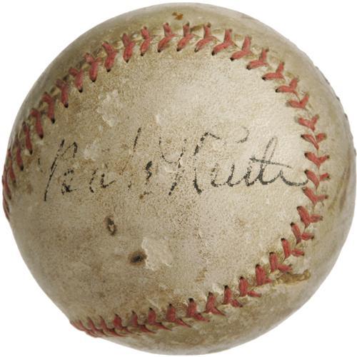 <B>1946 Babe Ruth's Last Home Run Baseball, Signed.</B></I> It's a little known fact that the Babe gave the final exhibition of his home run talents just two years before his death at age fifty-one while on vacation south of the Rio Grande. As the notarized letter from our consignor explains in "...May 1946 Babe Ruth was presenting a batting exhibition game in the former 'Parque Delta' in Mexico City. After a few attempts, Ruth hit a single home run. My father had the luck to catch Babe Ruth's home run hit and was fortunate enough to move amongst the crowd and have Babe Ruth sign his ball..." The consignor also supplied a photocopy of a June 2, 1946 New York TImes article that quotes Ruth as saying, "They gave me a wonderful time and I enjoyed every minute of it. I went fishing, I played golf, I took in a bull fight and in my farewell appearance in Mexico I poked a couple of home runs for them."<BR><BR> The consignor further explained that the ball survived a Mexican river flood that robbed the ball of some of its beauty but none of its historical significance. We can find no evidence of any manufacturer's stamping on this important sphere, but the Babe's side panel signature continues to resonate at a strength of 5/10.<BR><BR> Surely it must have felt good for the Babe, his health already fading, to watch one last baseball--this ball--drop over an outfield wall the way so many hundreds had in his glory years. The opportunity to own the piece that symbolizes the very end of the Babe Ruth home run era is not one to be taken lightly. <I>LOA from PSA/DNA. LOA from James Spence Authentication.</B></I><BR><BR><b>Shipping:</b> Balls, Pucks, etc., Small (<a target="_blank" href="http://www.heritageauctions.com/common/shipping.php">view shipping information</a>)