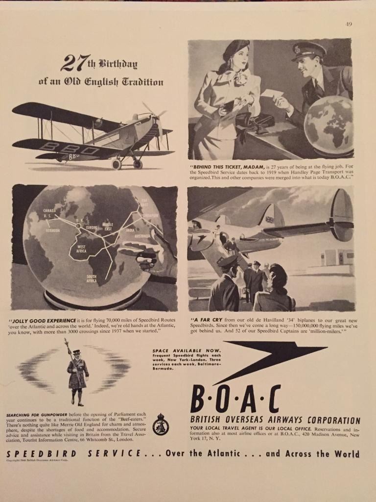 Original 1946 black white magazine advertisement for British Overseas Airways Corporation. Features 27th anniversary of "old English Tradition in travel. Frequent flights from New York to London services to Baltimore Bermuda. 10" X 13" mounted on archival linen for preservation.