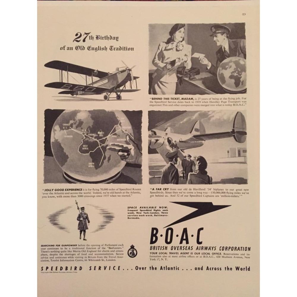 Original 1946 black & white magazine advertisement for British Overseas Airways Corporation. Features 27th anniversary of "old English Tradition in travel. Frequent flights from New York to London & services to Baltimore & Bermuda. 10" X 13" mounted on archival linen for preservation.