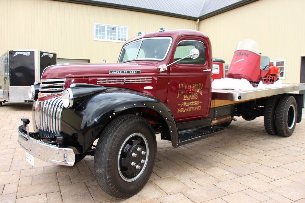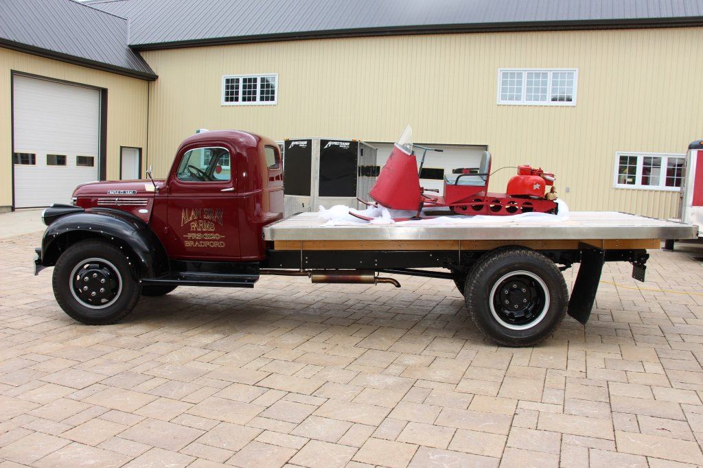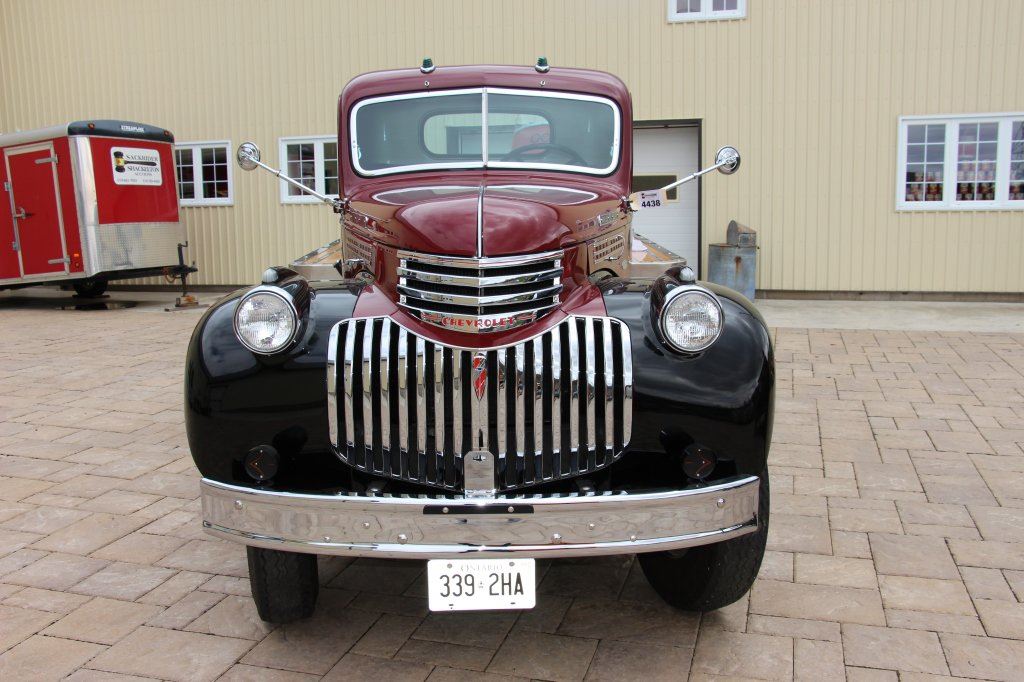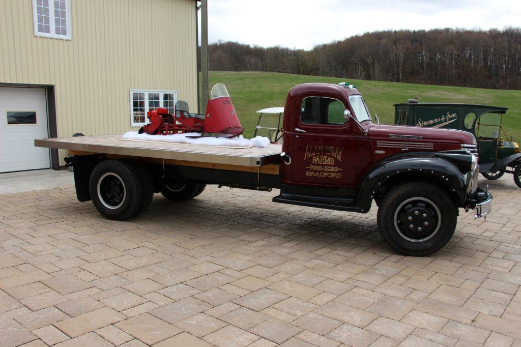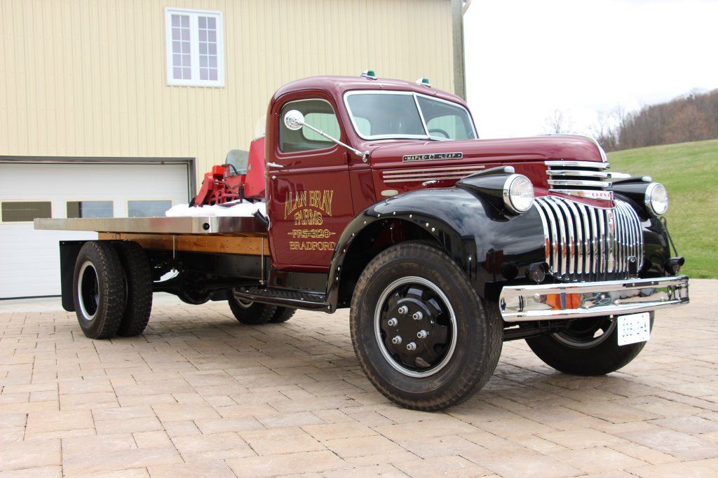 1946 CHEVROLET MAPLE LEAF 3 TON TRUCK EQUIPPED WITH A 248C.I. 6 CYLINDER THAT WAS REBUILT TO GM SPECS AND HAS HAD A COMPLETE BODY OFF RESTORATION. COMPETE WITH A GORGEOUS NEW STAKE BODY WITH WHITE OAK AND STAINLESS STEEL FRAMING THIS SHOW TRUCK IS A RE