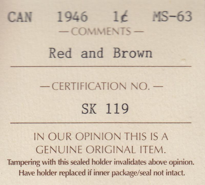 1946 Canadian Small One Cent Coin - Graded MS-63 By ICCS, Red & Brown (SK 119)