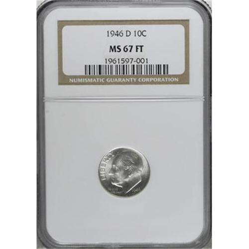 <B>1946-D 10C MS67 Full Bands NGC.</B></I> NGC Census: (444/3). PCGS Population (101/0). Mintage: 61,043,500. Numismedia Wsl. Price for NGC/PCGS coin in MS67: $48. (#5083)<BR><BR><B>Coin Engraver:</B> John R. Sinnock<BR><BR><b>Shipping:</b> Coins & Currency (<a target="_blank" href="http://www.heritageauctions.com/common/shipping.php">view shipping information</a>)