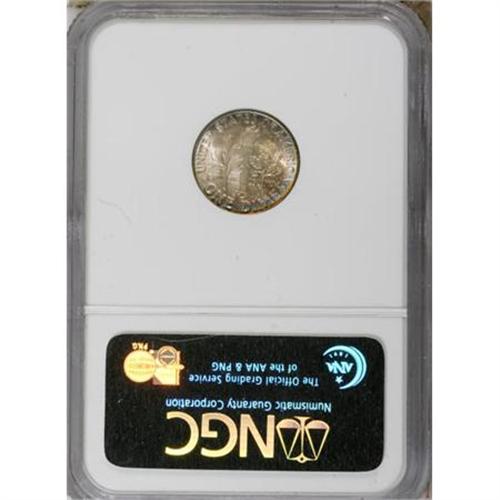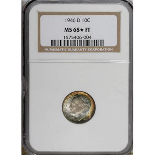 <B>1946-D 10C MS68 <img border='0' src='http://www.heritagecoins.com/images/star.gif' width=10 height=10> Full Torch NGC.</B></I> The Full Torch designation is the Roosevelt dime equivalent to the Full Band designation in the Mercury dime series. This superlative piece is fully struck with frosty silver luster shining through pastel blue, green, gold, and lilac toning. Census: 2 in 68<B> S</B></I>, 0 finer (6/07).<BR><BR><b>Shipping:</b> Coins & Currency (<a target="_blank" href="http://www.heritageauctions.com/common/shipping.php">view shipping information</a>)