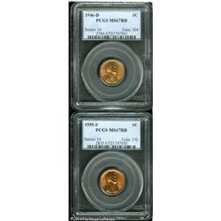 1946-D 1C MS67 Red PCGS, a magnificent Superb Gem <B>1946-D 1C MS67 Red PCGS,</B></I> a magnificent Superb Gem with carbonless and unabraded surfaces, medium gold color; and a <B>1955-S MS67 Red PCGS,</B></I> lovely honey-gold color, beautifully preserved, struck from clashed dies. 2 Coins <BR><BR><B>Important notice:</B> Heritage usually auctions material at the rate of 200-250 lots per hour. On some occasions eBay Live bid software or the Internet may not be able to keep up with the pace of the auction. We recommend placing a realistic absentee bid now as insurance to avoid disappointment. Occasionally the auctioneer may eliminate or reject an eBay Live bid, and the auctioneer may also reopen a lot after the close of the eBay live bidding (usually because we missed an audience bid), and may reject your bid even if it shows you as the winning bidder. By bidding via eBay Live, you agree that Heritage may award the lot to another bidder at its sole discretion under the circumstances described above or any other reasonable circumstances. Since eBay bids are not shown to us until we open the lot on the floor, we treat those bids just like floor bids. In most cases the floor responds before the eBay bid is presented to us, due to Internet lag time, so for consistency we have made it a policy that floor bids are always considered first over tie eBay live bids. Also please note that all Heritage lots purchased through eBay Live carry a 20% Buyer's Premium. Please make sure you read the Terms and Conditions before you bid. This lot is being auctioned in conjunction with a live floor auction by Heritage Galleries & Auctioneers. All final auction and invoice information will be supplied by Heritage Galleries & Auctioneers, and all other information should be considered preliminary. Lot:5364