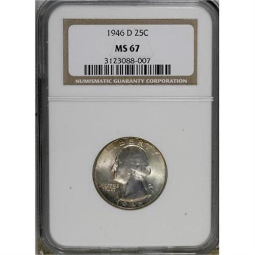 <B>1946-D 25C MS67 NGC.</B></I> NGC Census: (230/1). PCGS Population (30/0). Mintage: 9,072,800. Numismedia Wsl. Price for NGC/PCGS coin in MS67: $200. (#5831)<BR><BR><B>Coin Engraver:</B> John Flanagan<BR><BR><b>Shipping:</b> Coins & Currency (<a target="_blank" href="http://www.heritageauctions.com/common/shipping.php">view shipping information</a>)