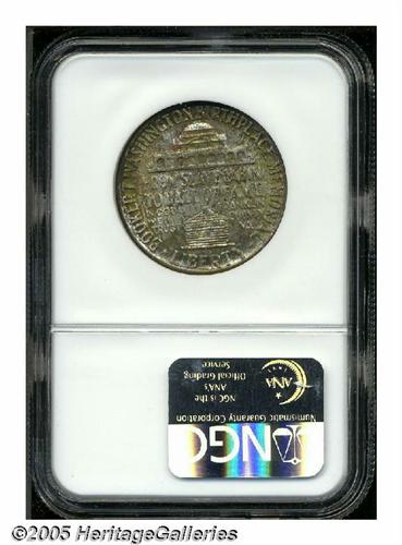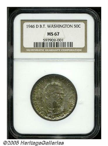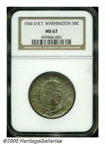 <B>1946-D<50C> Booker T. Washington MS67 NGC.</B></I> The superlative, nearly mark-free surfaces are covered with variegated green, russet, and rose colors that add immeasurably to the overall eye appeal of this technically well preserved coin. Very rare as such. Population: 34 in 67, 2 finer (4/05).