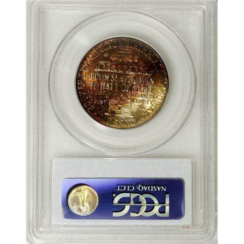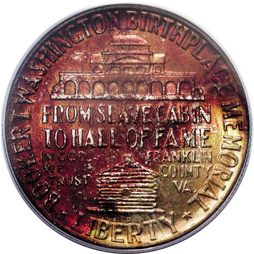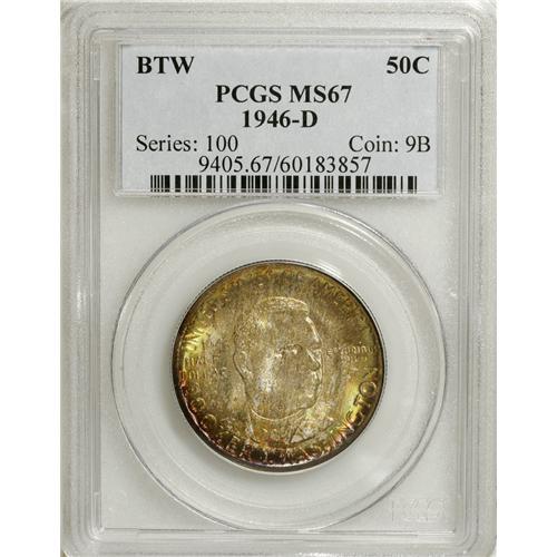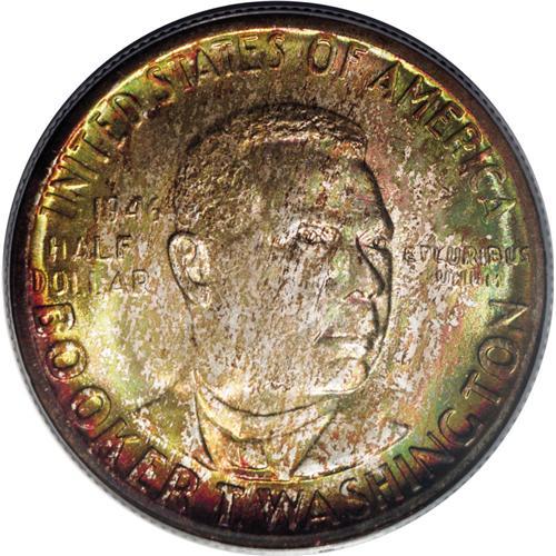 <B>1946-D 50C Booker T. Washington MS67 PCGS.</B></I> The moderate mint-green, yellow, and magenta obverse toning deepens on the reverse to magnificent maroon, with a quarter (or a bit) in canary-yellow. The luster is flashy, despite the deep coloration. A plentiful issue from the start of the six-year series, with none finer at PCGS. Population: 18 in 67, 0 finer (3/07).<BR><BR><b>Shipping:</b> Coins & Currency (<a target="_blank" href="http://www.heritageauctions.com/common/shipping.php">view shipping information</a>)