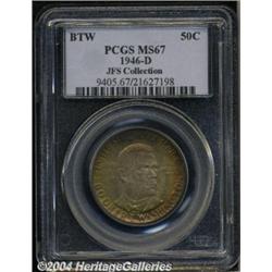 <B>1946-D<50C> Booker T. Washington MS67 PCGS.</B></I> Intense apple-green, orange, and ruby-red colors consume this boldly struck and lustrous Superb Gem. The reverse is essentially pristine, and the portrait and left obverse field also approach perfection in preservation. The collector of spectacularly toned Commemoratives knows that opportunities must be taken when they arise, since pieces such as the present lot are swiftly removed from the marketplace. Population: 9 in 67, none finer (6/04).<BR><I>From the JFS Collection, the #1 All-Time PCGS Registry Set.</B></I> <BR><BR><B>Important notice:</B> Heritage usually auctions material at the rate of 200-250 lots per hour. On some occasions eBay Live bid software or the Internet may not be able to keep up with the pace of the auction. We recommend placing a realistic absentee bid now as insurance to avoid disappointment. Occasionally the auctioneer may eliminate or reject an eBay Live bid, and the auctioneer may also reopen a lot after the close of the eBay live bidding (usually because we missed an audience bid), and may reject your bid even if it shows you as the winning bidder. By bidding via eBay Live, you agree that Heritage may award the lot to another bidder at its sole discretion under the circumstances described above or any other reasonable circumstances. Since eBay bids are not shown to us until we open the lot on the floor, we treat those bids just like floor bids. In most cases the floor responds before the eBay bid is presented to us, due to Internet lag time, so for consistency we have made it a policy that floor bids are always considered first over tie eBay live bids. Also please note that all Heritage lots purchased through eBay Live carry a 20% Buyer's Premium. Please make sure you read the Terms and Conditions before you bid. </span></font></tr></table></td></tr></table>