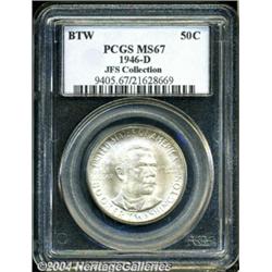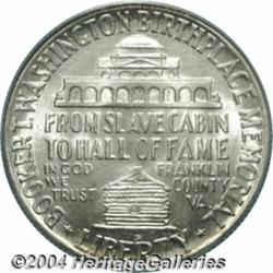 <B>1946-D<50C> Booker T. Washington MS67 PCGS.</B></I> Olive-gold patina illuminates the margins and surrounds the sky-blue fields of this lustrous Superb Gem. The portrait has faint freckles of honey color. A nearly undisturbed piece with a good strike on the cheek, which usually has abundant stria from the planchet prior to the strike. Initially released the same year as the Iowa Centennial issue. Booker T. Washington would also appear on the final type of the Commemorative Silver series along with George Washington Carver. Population: 9 in 67, none finer (6/04).<BR><I>From the JFS Collection, the #1 All-Time PCGS Registry Set.</B></I> <BR><BR><B>Important notice:</B> Heritage usually auctions material at the rate of 200-250 lots per hour. On some occasions eBay Live bid software or the Internet may not be able to keep up with the pace of the auction. We recommend placing a realistic absentee bid now as insurance to avoid disappointment. Occasionally the auctioneer may eliminate or reject an eBay Live bid, and the auctioneer may also reopen a lot after the close of the eBay live bidding (usually because we missed an audience bid), and may reject your bid even if it shows you as the winning bidder. By bidding via eBay Live, you agree that Heritage may award the lot to another bidder at its sole discretion under the circumstances described above or any other reasonable circumstances. Since eBay bids are not shown to us until we open the lot on the floor, we treat those bids just like floor bids. In most cases the floor responds before the eBay bid is presented to us, due to Internet lag time, so for consistency we have made it a policy that floor bids are always considered first over tie eBay live bids. Also please note that all Heritage lots purchased through eBay Live carry a 20% Buyer's Premium. Please make sure you read the Terms and Conditions before you bid. </span></font></tr></table></td></tr></table>
