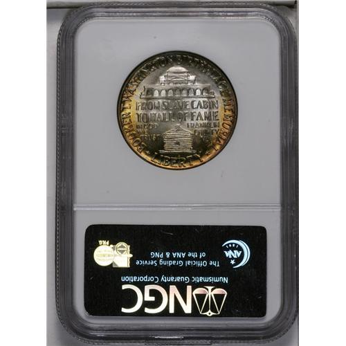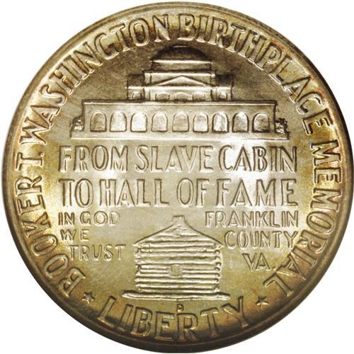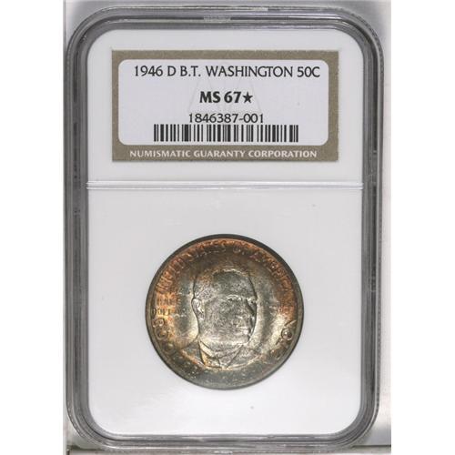 <B>1946-D<50C> Booker T. Washington MS67 <img border='0' src='http://www.heritagecoins.com/images/star.gif' width=10 height=10> NGC.</B></I> Vividly toned in mottled, variegated shades of apple-green, red-orange, gold, and charcoal-gray. Luster readily penetrates the deep patina, and the fields of this sharply struck Superb Gem are beautifully preserved. A coin that clearly deserves NGC's "Star" designation, indicating superior eye appeal. Census: 5 in 67 <img border='0' src='http://www.heritagecoins.com/images/star.gif' width=10 height=10>, 1 finer (5/06).