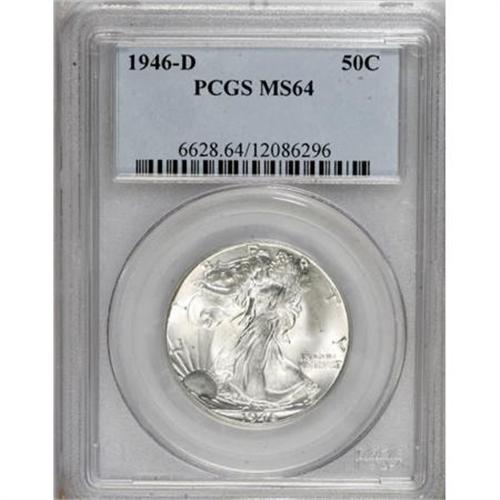 <B>1946-D 50C MS64 PCGS.</B></I> PCGS Population (5681/9123). NGC Census: (2503/6871). Mintage: 2,151,000. Numismedia Wsl. Price for NGC/PCGS coin in MS64: $60. (#6628)<BR><BR><B>Coin Engraver:</B> Adolph A. Weinman<BR><BR><b>Shipping:</b> Coins & Currency (<a target="_blank" href="http://www.heritageauctions.com/common/shipping.php">view shipping information</a>)