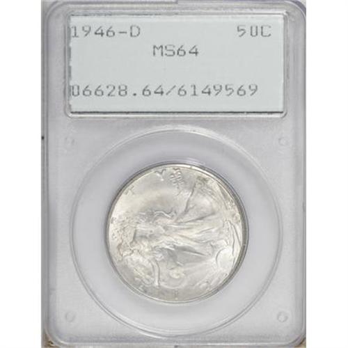 <B>1946-D 50C MS64 PCGS.</B></I> PCGS Population (5703/9164). NGC Census: (2510/6880). Mintage: 2,151,000. Numismedia Wsl. Price for NGC/PCGS coin in MS64: $60. (#6628)<BR><BR><B>Coin Engraver:</B> Adolph A. Weinman<BR><BR><b>Shipping:</b> Coins & Currency (<a target="_blank" href="http://www.heritageauctions.com/common/shipping.php">view shipping information</a>)
