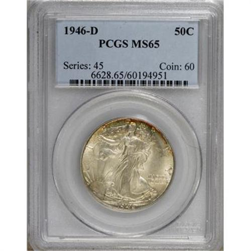 <B>1946-D 50C MS65 PCGS.</B></I> PCGS Population (7649/1352). NGC Census: (5198/1591). Mintage: 2,151,000. Numismedia Wsl. Price for NGC/PCGS coin in MS65: $132. (#6628)<BR><BR><B>Coin Engraver:</B> Adolph A. Weinman<BR><BR><b>Shipping:</b> Coins & Currency (<a target="_blank" href="http://www.heritageauctions.com/common/shipping.php">view shipping information</a>\)