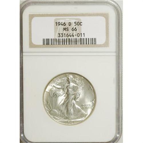 <B>1946-D 50C MS66 NGC.</B></I> NGC Census: (1506/85). PCGS Population (1318/34). Mintage: 2,151,000. Numismedia Wsl. Price for NGC/PCGS coin in MS66: $200. (#6628)<BR><BR><B>Coin Engraver:</B> Adolph A. Weinman<BR><BR><b>Shipping:</b> Coins & Currency (<a target="_blank" href="http://www.heritageauctions.com/common/shipping.php">view shipping information</a>\)
