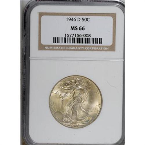 <B>1946-D 50C MS66 NGC.</B></I> NGC Census: (1513/84). PCGS Population (1332/34). Mintage: 2,151,000. Numismedia Wsl. Price for NGC/PCGS coin in MS66: $200. (#6628)<BR><BR><B>Coin Engraver:</B> Adolph A. Weinman<BR><BR><b>Shipping:</b> Coins & Currency (<a target="_blank" href="http://www.heritageauctions.com/common/shipping.php">view shipping information</a>)