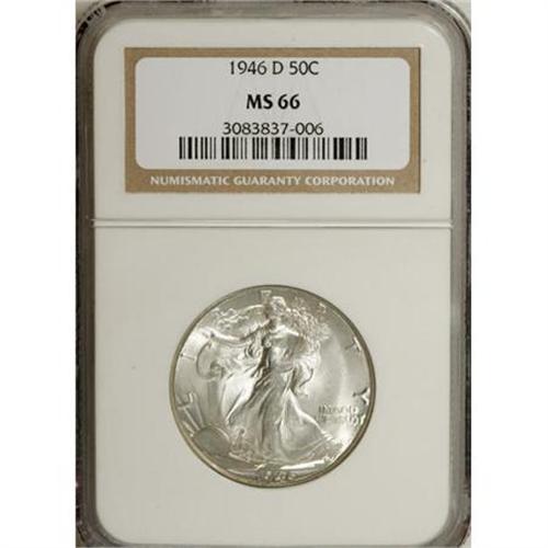 <B>1946-D 50C MS66 NGC.</B></I> NGC Census: (1506/85). PCGS Population (1321/34). Mintage: 2,151,000. Numismedia Wsl. Price for NGC/PCGS coin in MS66: $200. (#6628)<BR><BR><B>Coin Engraver:</B> Adolph A. Weinman<BR><BR><b>Shipping:</b> Coins & Currency (<a target="_blank" href="http://www.heritageauctions.com/common/shipping.php">view shipping information</a>)