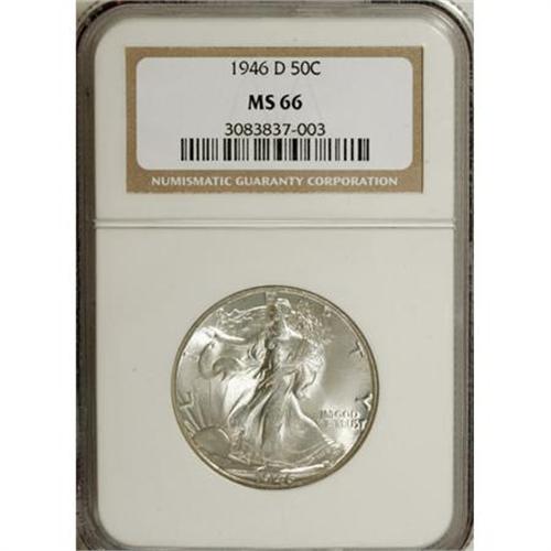<B>1946-D 50C MS66 NGC.</B></I> NGC Census: (1506/85). PCGS Population (1321/34). Mintage: 2,151,000. Numismedia Wsl. Price for NGC/PCGS coin in MS66: $200. (#6628)<BR><BR><B>Coin Engraver:</B> Adolph A. Weinman<BR><BR><b>Shipping:</b> Coins & Currency (<a target="_blank" href="http://www.heritageauctions.com/common/shipping.php">view shipping information</a>)