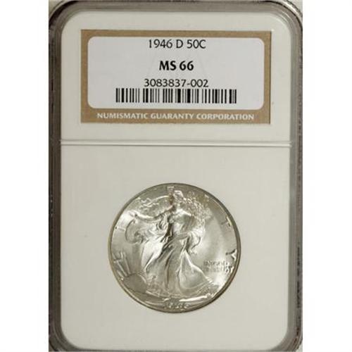 <B>1946-D 50C MS66 NGC.</B></I> NGC Census: (1506/85). PCGS Population (1321/34). Mintage: 2,151,000. Numismedia Wsl. Price for NGC/PCGS coin in MS66: $200. (#6628)<BR><BR><B>Coin Engraver:</B> Adolph A. Weinman<BR><BR><b>Shipping:</b> Coins & Currency (<a target="_blank" href="http://www.heritageauctions.com/common/shipping.php">view shipping information</a>)