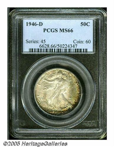 <B>1946-D<50C> MS66 PCGS.</B></I> The most common issue in the Short Set, and thus the most logical choice for a type set, this piece displays lovely, deep iridescent toning around the margins with a light accent of speckled coloration in the centers. Strong mint luster.