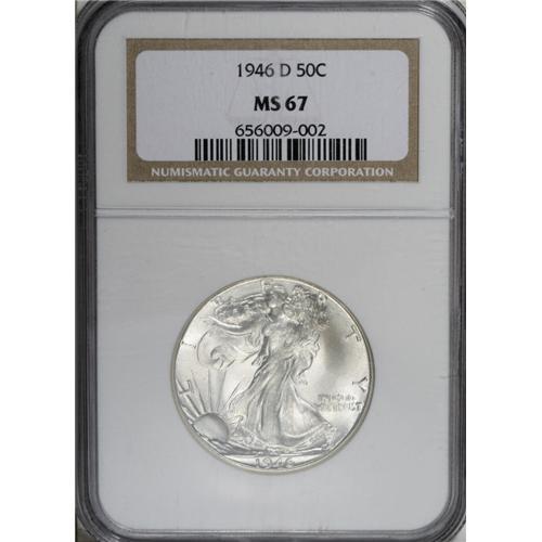 <B>1946-D 50C MS67 NGC.</B></I> A blush of rose appears over the frosty fields of this Superb Gem, which has an above-average strike. This piece is tied for the finest certified by either NGC or PCGS (11/06).<BR><BR><b>Shipping:</b> Coin/Currency (<a target="_blank" href="http://www.heritageauctions.com/common/shipping.php">view shipping information</a>)