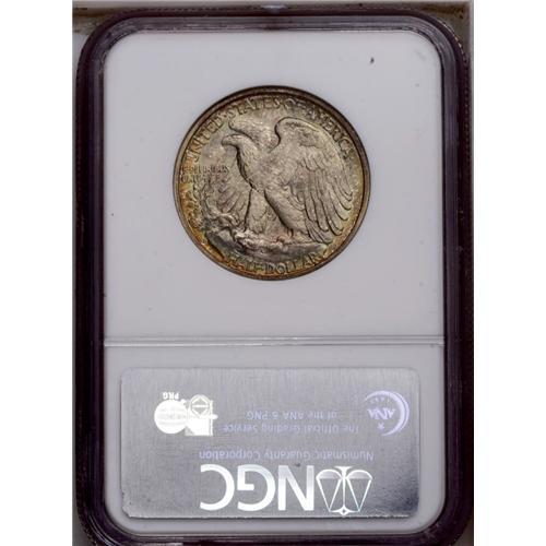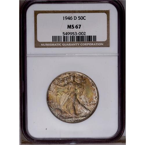<B>1946-D<50C> MS67 NGC.</B></I> Splashes of aquamarine, golden-brown, and rose toning consume this lustrous and sharply struck Superb Gem. A trophy for the connoisseur of color. Census: 77 in 67, 0 finer (3/06). <BR><BR><B>Important notice:</B> Heritage usually auctions material at the rate of 200-250 lots per hour. On some occasions eBay Live bid software or the Internet may not be able to keep up with the pace of the auction. We recommend placing a realistic absentee bid now as insurance to avoid disappointment. Occasionally the auctioneer may eliminate or reject an eBay Live bid, and the auctioneer may also reopen a lot after the close of the eBay live bidding (usually because we missed an audience bid), and may reject your bid even if it shows you as the winning bidder. By bidding via eBay Live, you agree that Heritage may award the lot to another bidder at its sole discretion under the circumstances described above or any other reasonable circumstances. Since eBay bids are not shown to us until we open the lot on the floor, we treat those bids just like floor bids. In most cases the floor responds before the eBay bid is presented to us, due to Internet lag time, so for consistency we have made it a policy that floor bids are always considered first over tie eBay live bids. Also please note that all Heritage lots purchased through eBay Live carry a 20% Buyer's Premium. Please make sure you read the Terms and Conditions before you bid. This lot is being auctioned in conjunction with a live floor auction by Heritage Galleries & Auctioneers. All final auction and invoice information will be supplied by Heritage Galleries & Auctioneers, and all other information should be considered preliminary. Lot:3025 <BR><BR><B>Winning Notification and Billing:</B> After the FINAL session in this auction is complete, Heritage will send e-mail and snail mail invoices. This process normally takes several days. All final auction and invoice information will be supplied by Heritage Galleries & Auctioneers, and all other information should be considered preliminary. <BR><BR>This auction will be conducted on a live auction floor and over the Internet through eBay Live. If you choose to place an absentee bid, please take a moment to <font color='#0000ff'><u><a href='http://pages.ebay.com/liveauctions/help/before/laabsentee.html'>learn how eBay Live absentee bidding works</a></u></font><font color='#000000'>