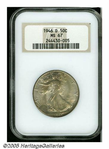 <B>1946-D<50C> MS67 NGC.</B></I> This Superb Gem is sharply struck and lightly toned with underlying frosty luster. Both sides have light heather toning. Although well struck examples are not rare, weak strikes were the rule for this issue. Population: 72 in 67, 0 finer (6/05).<BR><I>From The Robert Moreno Collection.</B></I>