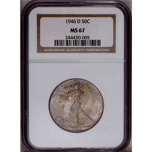 <B>1946-D<50C> MS67 NGC.</B></I> This Superb Gem is sharply struck and lightly toned with underlying frosty luster. Both sides have light heather toning. Although well struck examples are not rare, weak strikes were the rule for this issue.