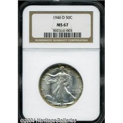 <B>1946-D<50C> MS67 NGC.</B></I> While the post-World War Two Walking Liberty Half Dollar issues are a bit more challenging to locate than their 1941-1945 counterparts, examples can still be had in most grades with a minimum amount of searching. Then there is the present Superb Gem. Conditionally scarce, the richly frosted surfaces are exceptionally smooth with nary a distracting bagmark to report. Untoned in the centers with lovely, original, copper-gold tinting at the borders. <BR><BR><B>Important notice:</B> Heritage usually auctions material at the rate of 200-250 lots per hour. On some occasions eBay Live bid software or the Internet may not be able to keep up with the pace of the auction. We recommend placing a realistic absentee bid now as insurance to avoid disappointment. Occasionally the auctioneer may eliminate or reject an eBay Live bid, and the auctioneer may also reopen a lot after the close of the eBay live bidding (usually because we missed an audience bid), and may reject your bid even if it shows you as the winning bidder. By bidding via eBay Live, you agree that Heritage may award the lot to another bidder at its sole discretion under the circumstances described above or any other reasonable circumstances. Since eBay bids are not shown to us until we open the lot on the floor, we treat those bids just like floor bids. In most cases the floor responds before the eBay bid is presented to us, due to Internet lag time, so for consistency we have made it a policy that floor bids are always considered first over tie eBay live bids. Also please note that all Heritage lots purchased through eBay Live carry a 20% Buyer's Premium. Please make sure you read the Terms and Conditions before you bid.