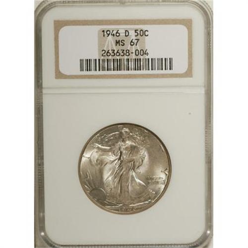 <B>1946-D 50C MS67 NGC.</B></I> In the years immediately following World War II, demand for coinage fell, and fewer than 2.2 million pieces were struck for this D-mint issue. An elegant blend of sun-gold and violet patina graces the shimmering surfaces of the well struck Superb Gem offered here. Neither NGC nor PCGS has certified a numerically finer example (5/07).<BR><I>From The Vanek Collection.</B></I><BR><BR><b>Shipping:</b> Coins & Currency (<a target="_blank" href="http://www.heritageauctions.com/common/shipping.php">view shipping information</a>)