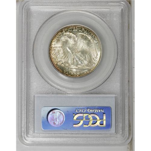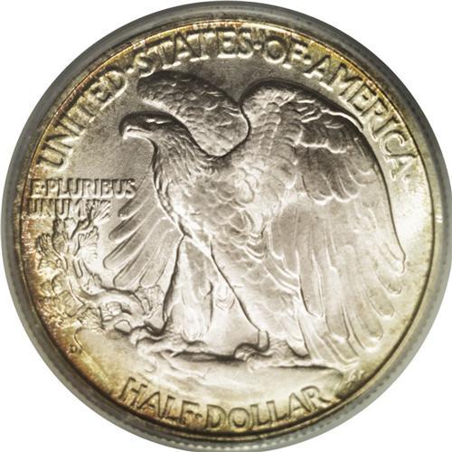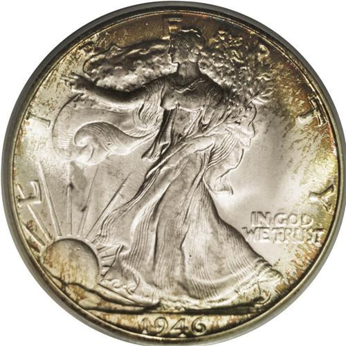 <B>1946-D<50C> MS67 PCGS.</B></I> This Superb Mint State specimen has frosty luster beneath pale ivory color with deep lilac, gold and iridescent toning along the borders. It is an important piece that is tied for the finest example certified by PCGS, along with 33 other similar coins (9/06).