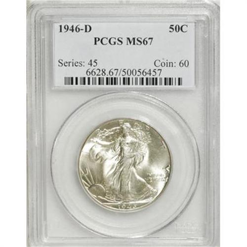 <B>1946-D 50C MS67 PCGS.</B></I> Excellent definition on the branch hand and strong, shining luster are the major draws of this beautifully preserved Superb Gem. Highly appealing. Neither NGC nor PCGS has graded a numerically finer example (12/07).<BR><BR><B>Coin Engraver:</B> Adolph A. Weinman<BR><BR><b>Shipping:</b> Coins & Currency (<a target="_blank" href="http://www.heritageauctions.com/common/shipping.php">view shipping information</a>)