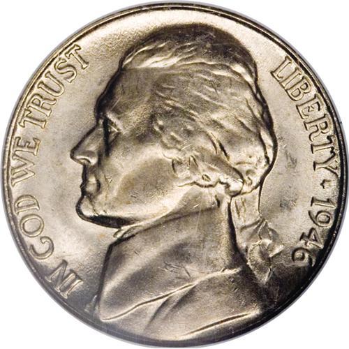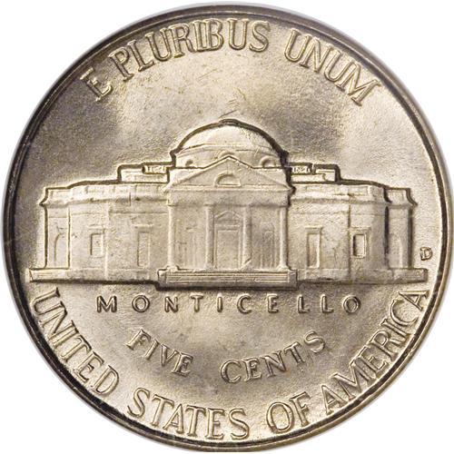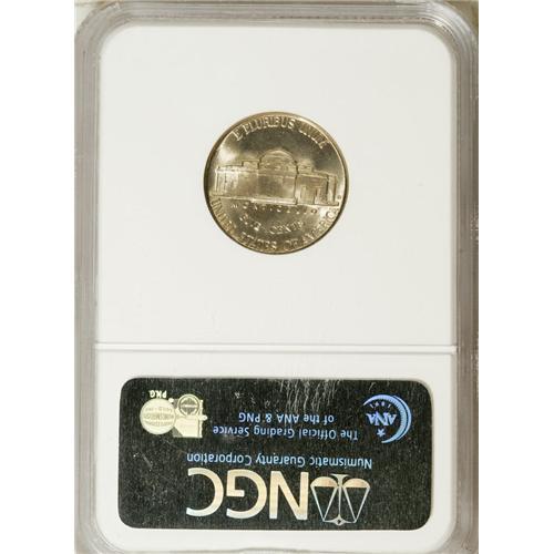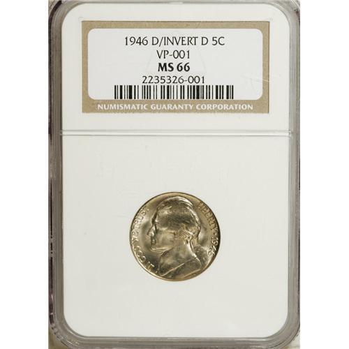 <B>1946-D 5C MS66 NGC.</B></I> D over Inverted D. The mintmark was first punched upside down, and then corrected with the curve of the first D visible along the left upright of the corrected D. This piece is also sharply struck with five steps visible on the reverse. Both sides have satiny luster with light gold toning.<BR><BR><b>Shipping:</b> Coins & Currency (<a target="_blank" href="http://www.heritageauctions.com/common/shipping.php">view shipping information</a>)
