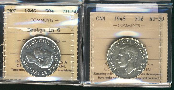 1946 Des & 1948 50¢ ICCS AU50. Lot of 2 coins.