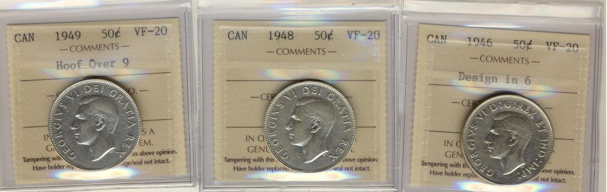 1946 Design, 1948 & 1949 Hoof 50¢. Lot of 3 popular issues all in ICCS VF20 holders.