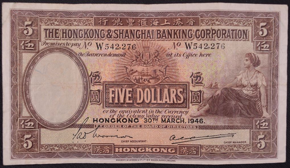 One 1946 Five Dollar Hong Kong and Shanghai Banking Corporation.