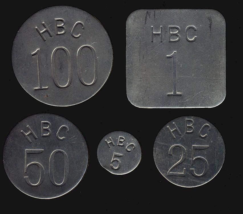1946 Hudson Bay Tokens. Set of 5 pieces. 5¢, 25¢, 50¢, $1 an