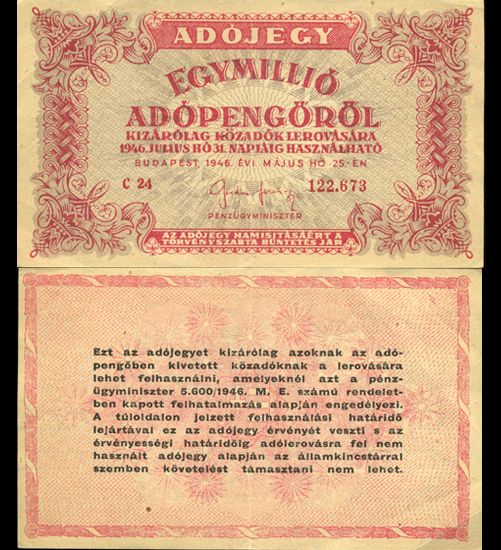 1946 Hungary 1MM Pengo Tax Note Hi Grade Scarce (CUR-006121)