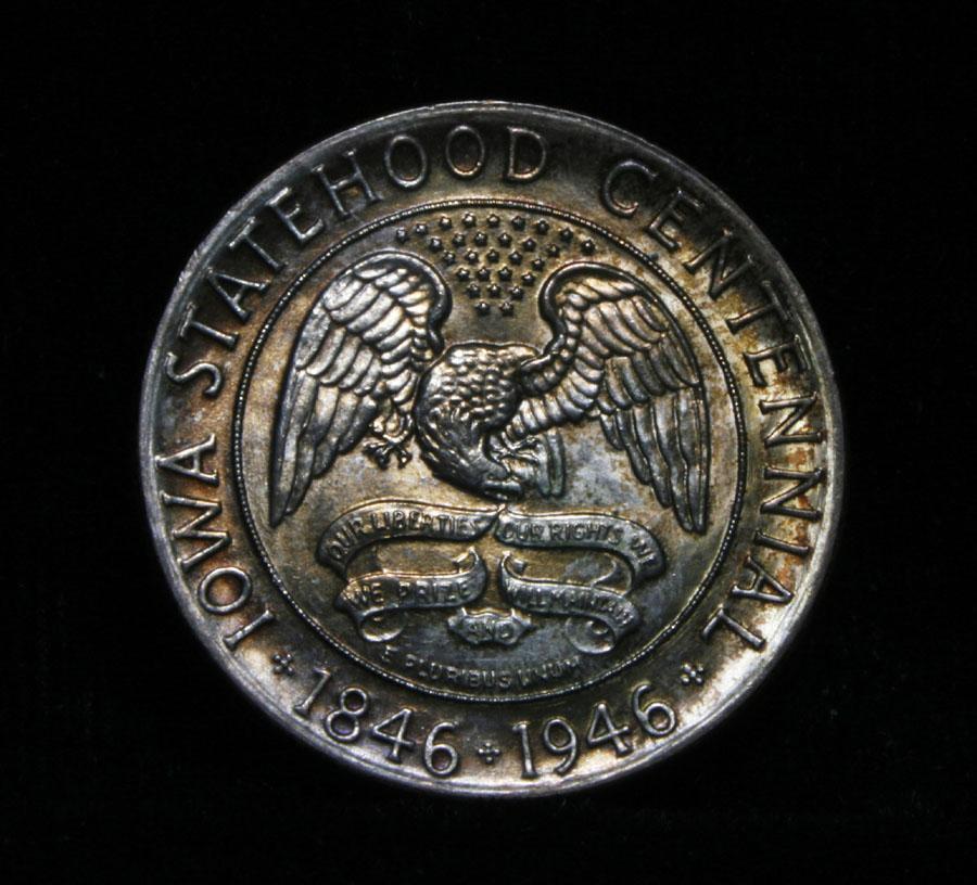 Stunning rainbow toned example. I offer a 2x buyback if this coin is not 100% original toning and fully gradable never having been cleaned in any way. Vastly superior eye appeal. The Iowa and the Booker T. Washington were approved on the same day by President Truman and mark an end to the old commemorative program. When looking at an Iowa Commemorative check for signs of wear on the eagle’s neck and head and on the building’s central pillars. PCGS lists ms67 at $400. Estimated Value $300.